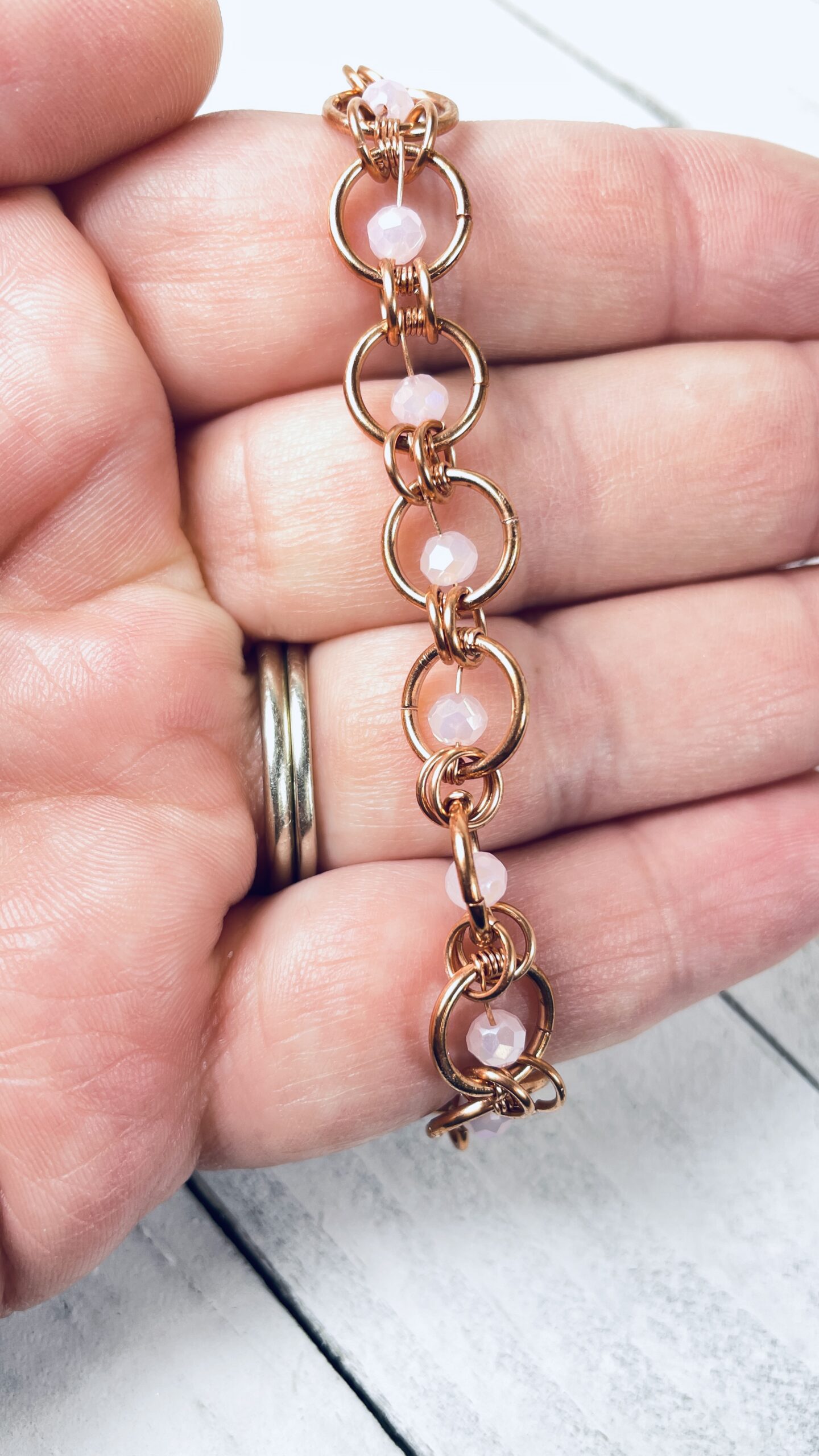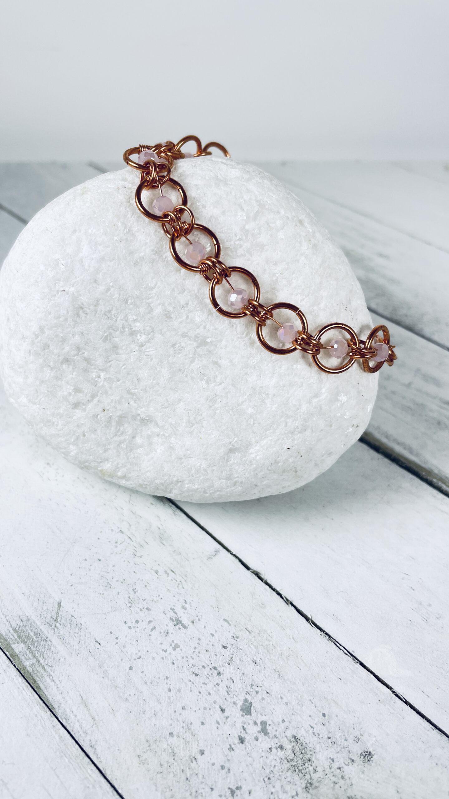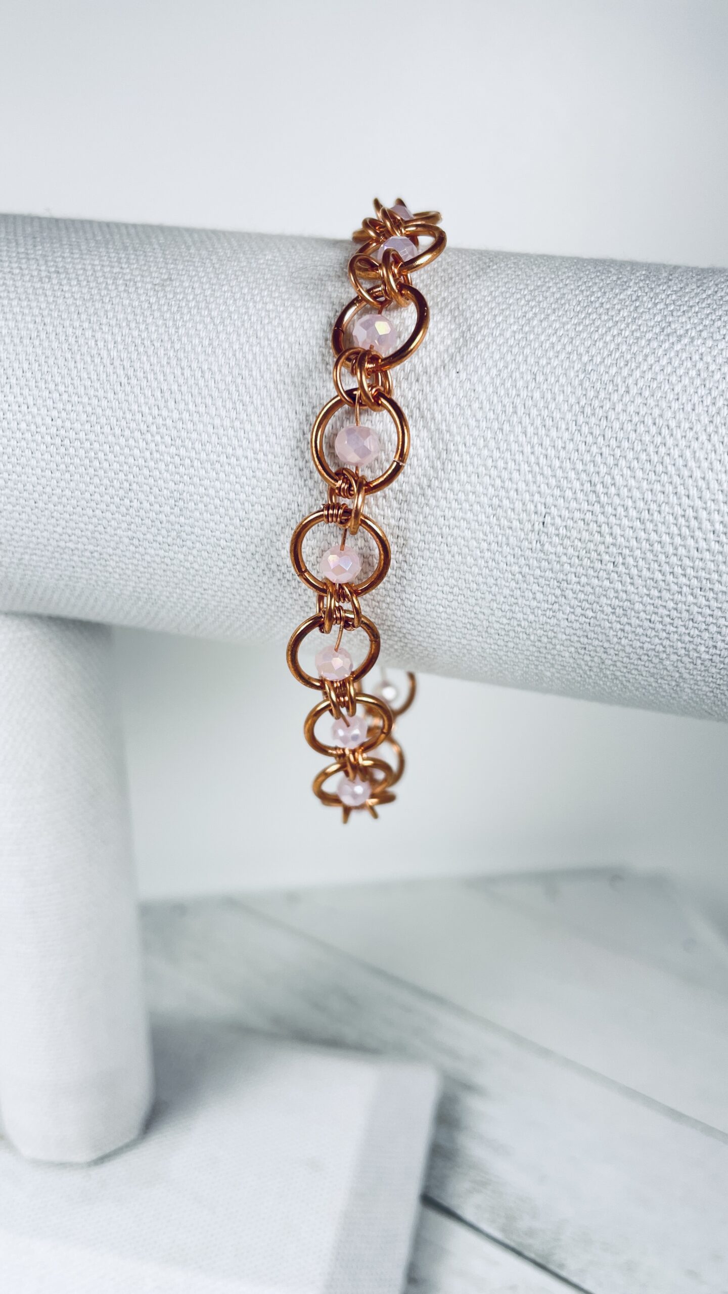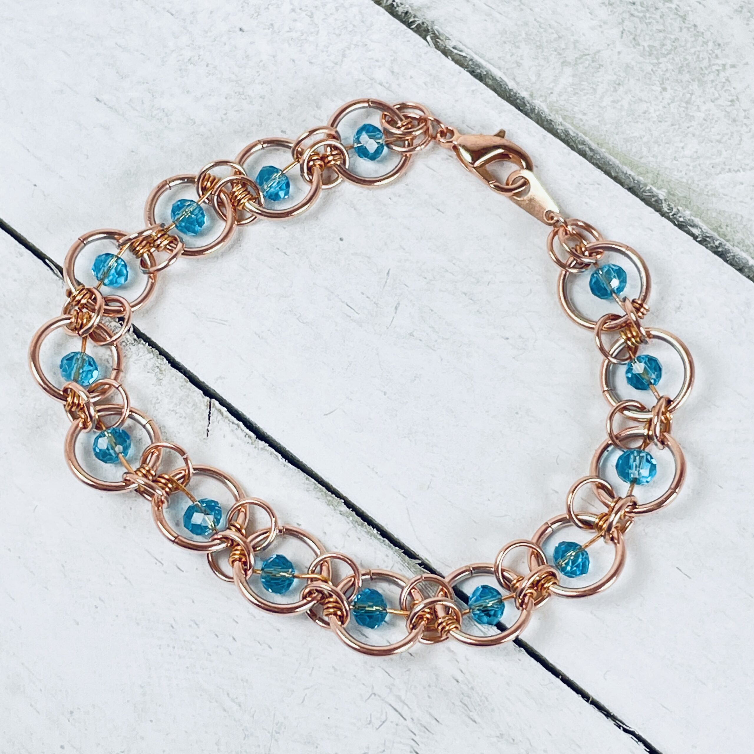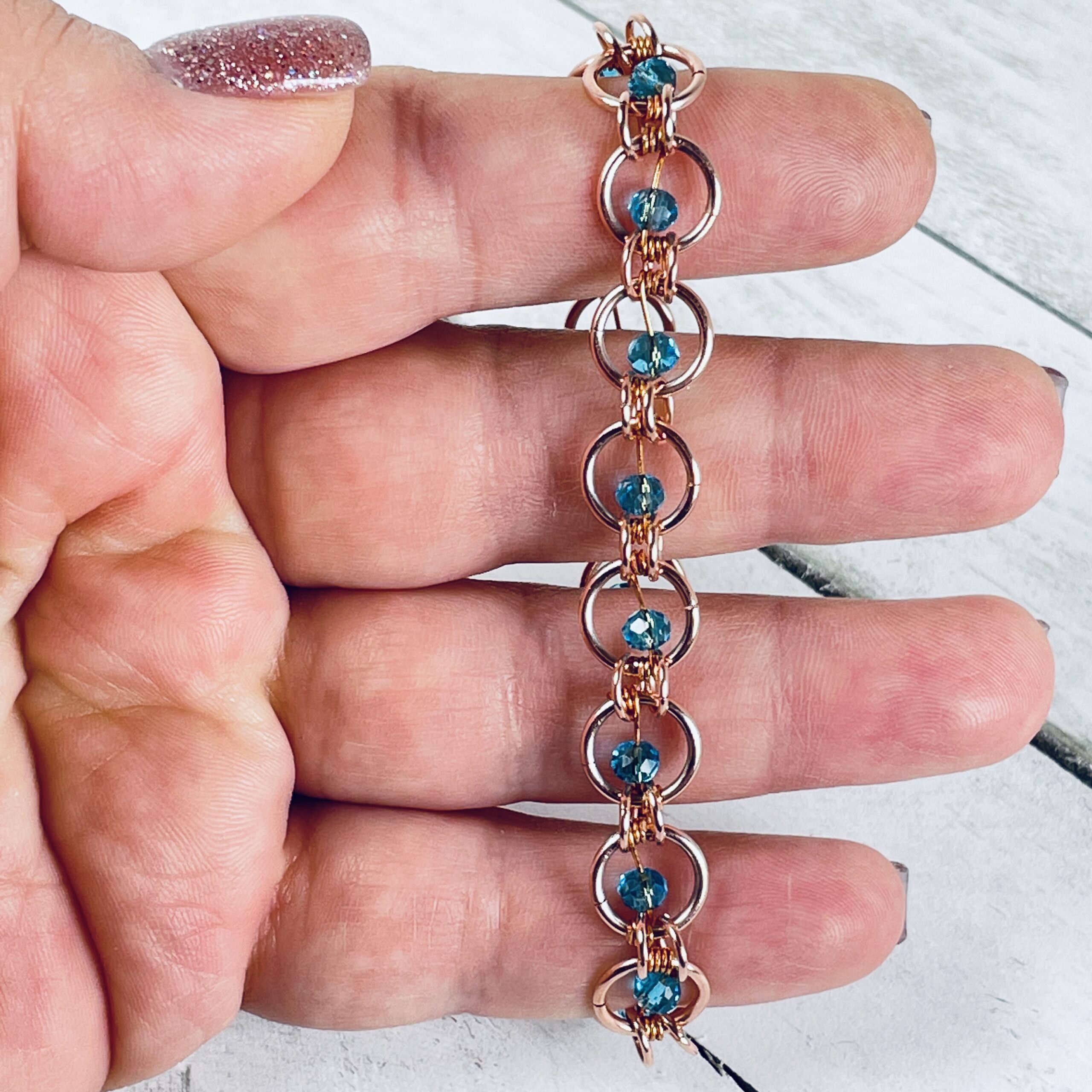 Copper suspended bead bracelet with 14-16* suspended center rondel glass beads. This listing contains multiple color options (shown in photo gallery below) for the center 4mm rondel bead. Please note, this listing has more beads than the Glass Rondel Bead Chainmail Bracelet, this is the reason for the price difference.
